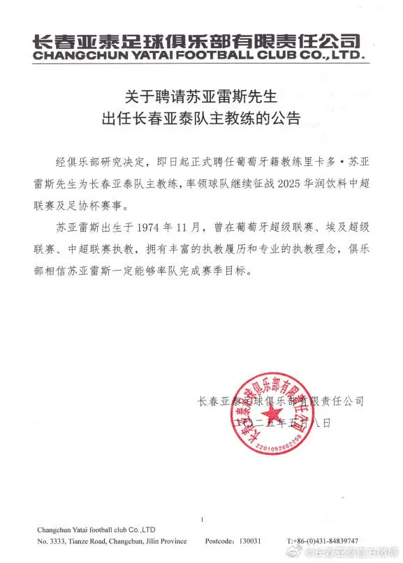 经俱乐部研究决定,即日起正式聘任葡萄牙籍教练里卡多·苏亚雷斯先生为长春亚泰队主教练,率领球队继续征战2025华润饮料中超联赛及足协杯赛事。