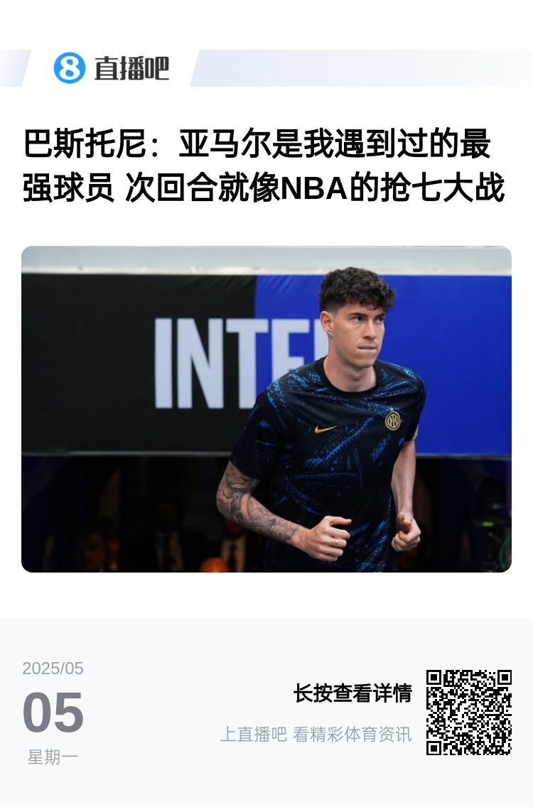 次回合比赛赛前,巴斯托尼给予了亚马尔极高的评价:“他是我交手过的最强球员。亚马尔达到的水平令人印象深刻,创造机会的能力堪称一绝。至于如何限制他,我们得像首回合那样,对他进行双人甚至三人包夹。巴萨可不止有亚马尔,他们的进攻阵容令人羡慕。”