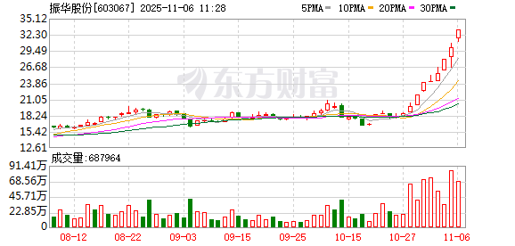 振华股份再度涨停,7个交易日内录得4个涨停,累计涨幅为67.00%,累计换手率为59.33%。截至10:50,该股今日成交量6204.28万股,成交金额19.92亿元,换手率8.73%。最新A股总市值达235.26亿元。