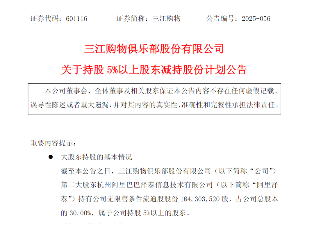 持股九年后,今年4月,三江购物披露,阿里泽泰拟减持不超过3%的公司股份。